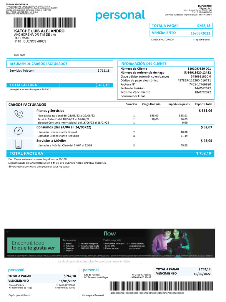 TOTAL A PAGAR $ 762,18 .... Nro de Factura