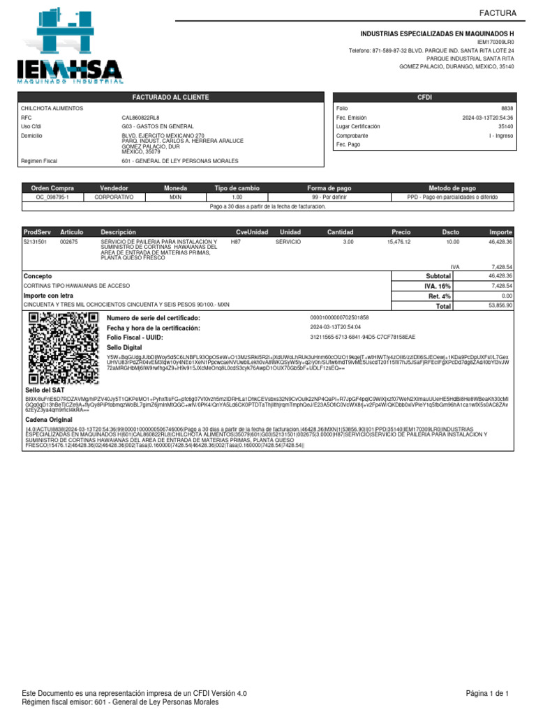 ||4.0|ACTU|8838|2024-03-13T[Link]|99|00001000000506746006|Pago a 30 dias a partir de la fecha de facturacion.|46428.36|MXN|1|53856.90|I|01|PPD|35140|IEM170309LR0|INDUSTRIAS