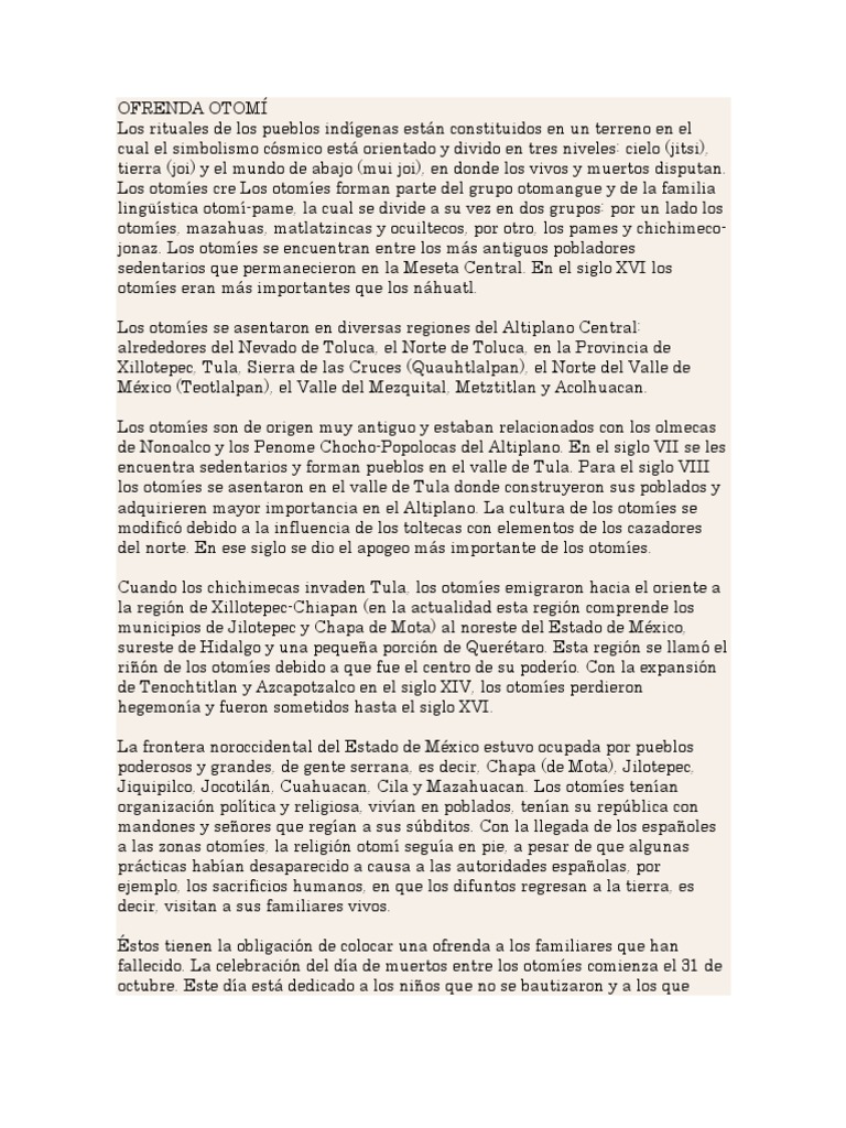 y divido en tres niveles: cielo (jitsi), tierra (joi) y el mundo de abajo (mui joi), en donde los vivos y muertos disputan. Los otomes cre Los otomes forman parte del grupo otomangue y de la familia lingstica otom-pame, la cual se divide a su vez en dos grupos: por un lado los otomes, mazahuas, matlatzincas y ocuiltecos, por otro, los pames y chichimecojonaz. Los otomes se encuentran entre los ms antiguos pobladores sedentarios que permanecieron en la Meseta Central. En el siglo XVI los otomes eran ms importantes que los nhuatl. Los otomes se asentaron en diversas regiones del Altiplano Central: alrededores del Nevado de Toluca, el Norte de Toluca, en la Provincia de Xillotepec, Tula, Sierra de las Cruces (Quauhtlalpan), el Norte del Valle de Mxico (Teotlalpan), el Valle del Mezquital, Metztitlan y Acolhuacan. Los otomes son de origen muy antiguo y estaban relacionados con los olmecas de Nonoalco y los Penome Chocho-Popolocas del Altiplano. En el siglo VII se les encuentra sedentarios y forman pueblos en el valle de Tula. Para el siglo VIII los otomes se asentaron en el valle de Tula donde construyeron sus poblados y adquirieren mayor importancia en el Altiplano. La cultura de los otomes se modific debido a la influencia de los toltecas con elementos de los cazadores del norte. En ese siglo se dio el apogeo ms importante de los otomes. Cuando los chichimecas invaden Tula, los otomes emigraron hacia el oriente a la regin de Xillotepec-Chiapan (en la actualidad esta regin comprende los municipios de Jilotepec y Chapa de Mota) al noreste del Estado de Mxico, sureste de Hidalgo y una pequea porcin de Quertaro. Esta regin se llam el rin de los otomes debido a que fue el centro de su podero. Con la expansin de Tenochtitlan y Azcapotzalco en el siglo XIV, los otomes perdieron hegemona y fueron sometidos hasta el siglo XVI. La frontera noroccidental del Estado de Mxico estuvo ocupada por pueblos poderosos y grandes, de gente serrana, es decir, Chapa (de Mota), Jilotepec, Jiquipilco, Jocotiln, Cuahuacan, Cila y Mazahuacan. Los otomes tenan organizacin poltica y religiosa, vivan en poblados, tenan su repblica con mandones y seores que regan a sus sbditos. Con la llegada de los espaoles a las zonas otomes, la religin otom segua en pie, a pesar de que algunas prcticas haban desaparecido a causa a las autoridades espaolas, por ejemplo, los sacrificios humanos, en que los difuntos regresan a la tierra, es decir, visitan a sus familiares vivos. stos tienen la obligacin de colocar una ofrenda a los familiares que han fallecido. La celebracin del da de muertos entre los otomes comienza el 31 de octubre. Este da est dedicado a los nios que no se bautizaron y a los que