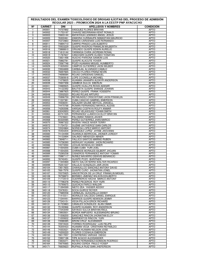 RESULTADOS DEL EXAMEN TOXICOLÓGICO DE DROGAS ILÍCITAS DEL PROCESO DE ADMISIÓN