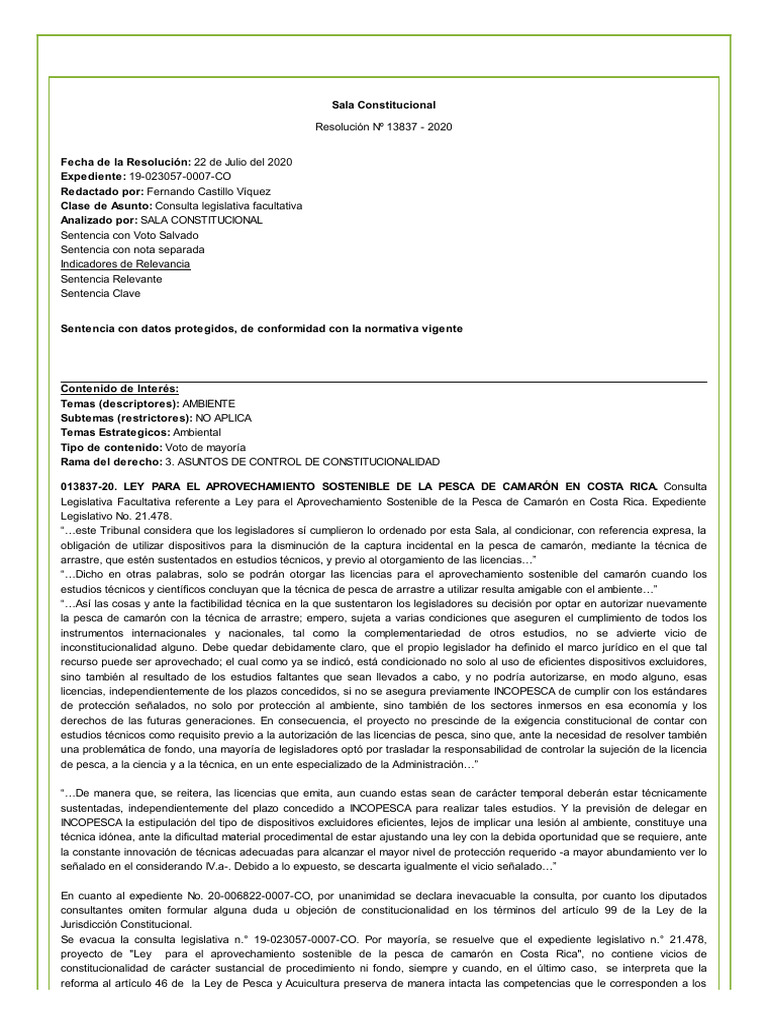 camarón. · En el voto 7978-2019 de la Sala Constitucional se establece que “para la toma de decisiones en esa materia resultaba