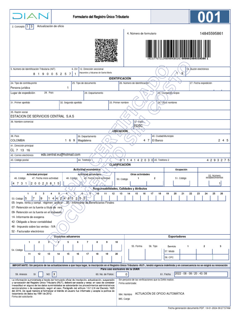 8 1 9 0 0 5 2 5 7 1 ESTACION DE SERVICIOS CENTRAL E. U