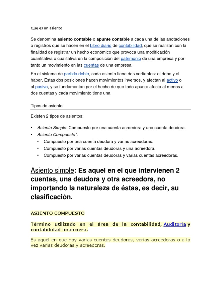 diario de contabilidad, que se realizan con la finalidad de registrar un hecho econmico que provoca una modificacin cuantitativa o cualitativa en la composicin del patrimonio de una empresa y por tanto un movimiento en las cuentas de una empresa. En el sistema de partida doble, cada asiento tiene dos vertientes: el debe y el haber. Estas dos posiciones hacen movimientos inversos, y afectan al activo o al pasivo, y se fundamentan por el hecho de que todo apunte afecta al menos a dos cuentas y cada movimiento tiene una Tipos de asiento Existen 2 tipos de asientos: