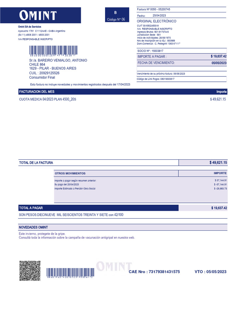 CUIL : 20929125526 Vencimiento de su próxima factura: 06/06/2023