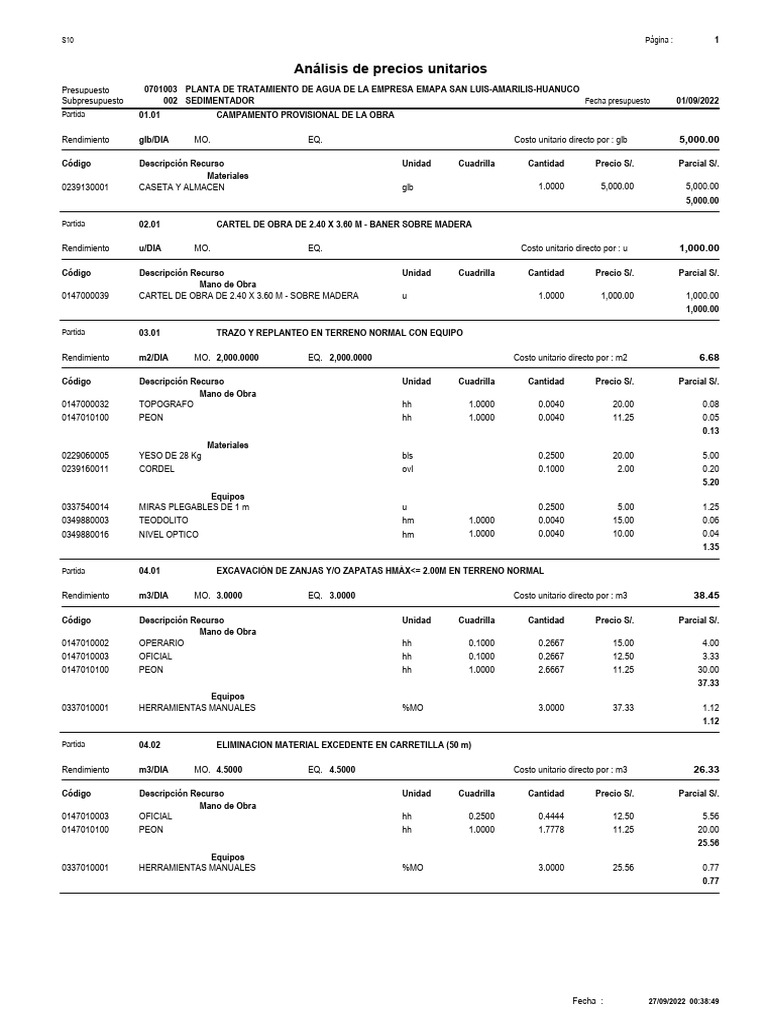 Subpresupuesto 002 SEDIMENTADOR Fecha presupuesto 01/09/2022
