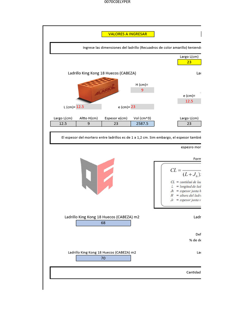Ingrese las dimensiones del ladrillo (Recuadros de color amarillo) teniendo en cuenta que el lar