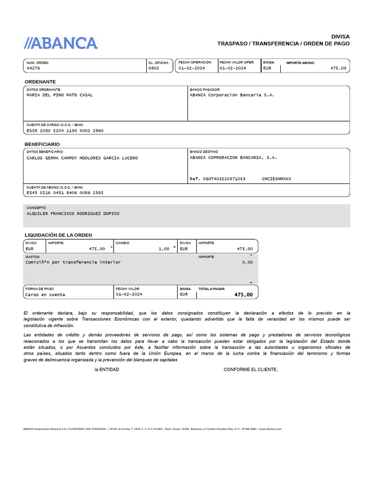 ABANCA Corporación Bancaria S.A. ("la ENTIDAD") NIF A70302039 - I. Rº.M. A Coruña, T. 3426, F. 1, H. C-47.803 – Dom. Social: 15300. Betanzos, c/ Cantón Claudino Pita, nº 2 – Rº BB 2080 – [Link]