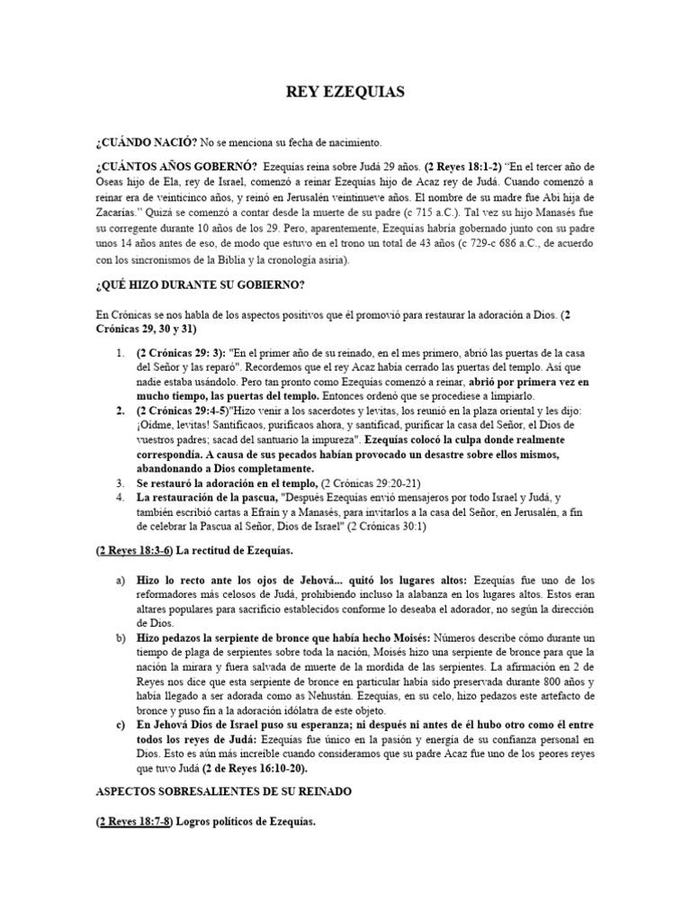 Reinó en Jerusalén veintinueve años. Ezequías fue uno de los mejores reyes de Judá, y por lo tanto tuvo un