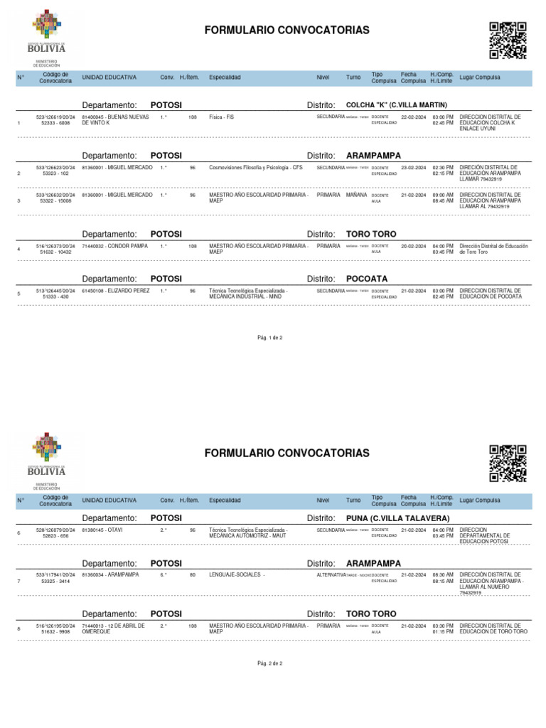 516/126373/20/24 71440032 - CONDOR PAMPA 1.° 108 MAESTRO AÑO ESCOLARIDAD PRIMARIA - PRIMARIA MAÑANA - TARDE DOCENTE 20-02-2024 04:00 PM Dirección Distrital de Educación