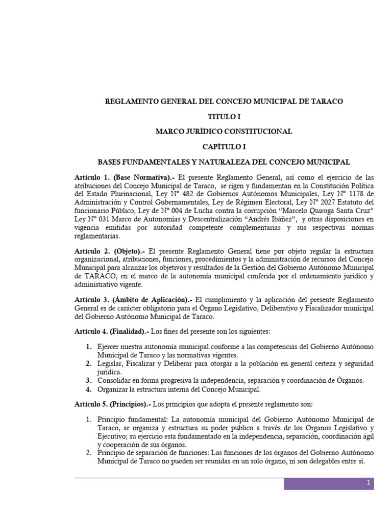 Artículo 7. (Autoridad del Concejo Municipal de Taraco).- El pleno del Concejo Municipal del