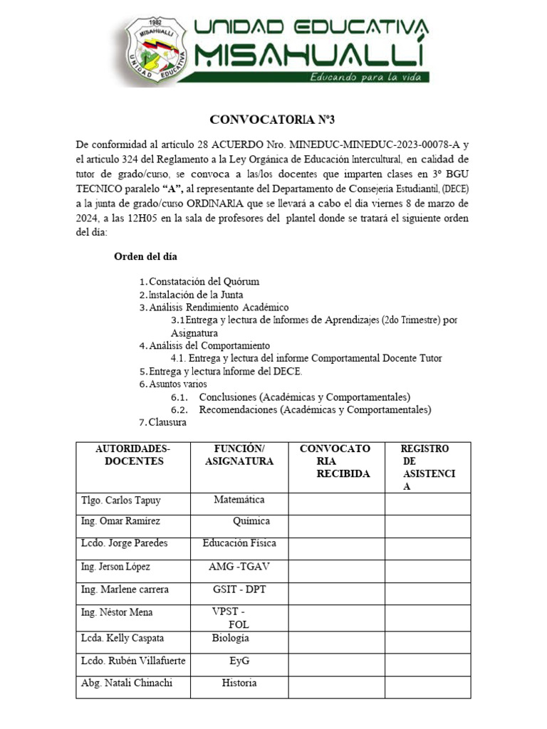2024, a las 12H05 en la sala de profesores del plantel donde se tratará el siguiente orden
