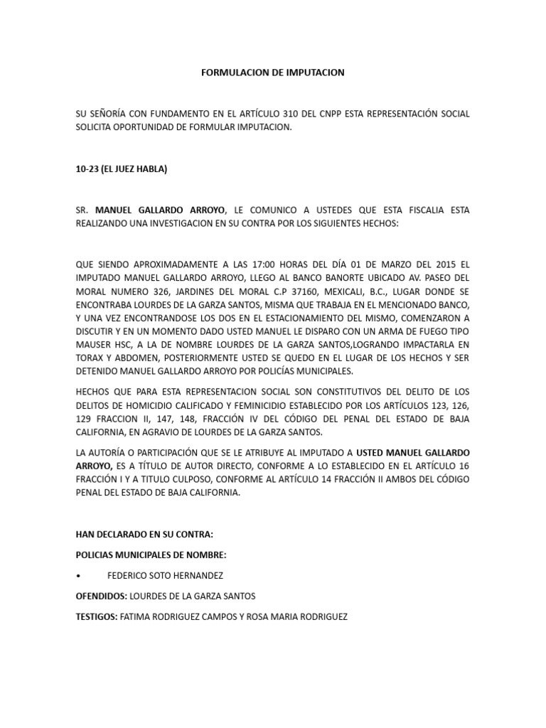 LA AUTORÍA O PARTICIPACIÓN QUE SE LE ATRIBUYE AL IMPUTADO A USTED MANUEL GALLARDO
