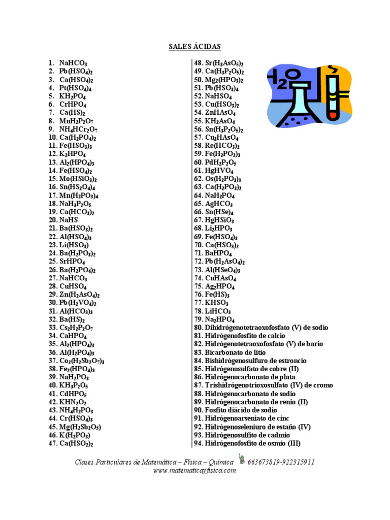 Fe(HSO3)3 12. K2HPO4 13. Al2(HPO4)3 14. Fe(HSO4)2 15. Mo(HSiO3)2 16. Sn(HS2O4)4 17. Mn(H2PO3)4 18. NaH3P2O5 19. Ca(HCO3)2 20. NaHS 21. Ba(HSO3)2 22. Al(HSO4)3 23. Li(HSO3) 24. Ba(H2PO3)2 25. SrHPO4 26. Ba(H2PO4)2 27. NaHCO3 28. CuHSO4 29. Zn(H2AsO4)2 30. Pb(H2VO4)2 31. Al(HCO3)3 32. Ba(HS)2 33. Cs2H2P2O7 34. CaHPO4 35. Al2(HPO4)3 36. Al(H2PO4)3 37. Co2(H2Sb2O7)3 38. Fe2(HPO4)3 39. NaH2PO3 40. KH3P2O5 41. CdHPO5 42. KHN2O2 43. NH4H2PO3 44. Cr(HSO4)3 45. Mg(H2Sb2O5) 46. K(H2PO3) 47. Ca(HSO2)2 48. Sr(H3AsO5)2 49. Ca(H3P2O5)2 50. Mg2(HPO3)2 51. Pb(HSO3)4 52. NaHSO4 53. Cu(HSO3)2 54. ZnHAsO4 55. KH2AsO4 56. Sn(H3P2O5)2 57. Cu2HAsO4 58. Re(HCO3)2 59. Fe(H2PO2)3 60. PdH2P2O5 61. HgHVO4 62. Os(H2PO3)3 63. Ca(H2PO3)2 64. NaH2PO4 65. AgHCO3 66. Sn(HSe)4 67. HgHSiO3 68. Li2HPO3 69. Fe(HSO4)3 70. Ca(HSO3)2 71. BaHPO4 72. Pb(H2AsO4)2 73. Al(HSeO4)3 74. CuHAsO4 75. Ag2HPO4 76. Fe(HS)3 77. KHSO3 78. LiHCO3 79. Na2HPO4 80. Dihidrgenotetraoxofosfato (V) de sodio 81. Hidrgenofosfito de calcio 82. Hidrgenotetraoxofosfato (V) de bario 83. Bicarbonato de litio 84. Bishidrgenosulfuro de estroncio 85. Hidrgenosulfato de cobre (II) 86. Hidrgenocarbonato de plata 87. Trishidrgenotrioxosulfato (IV) de cromo 88. Hidrgenocarbonato de sodio 89. Hidrgenocarbonato de renio (II) 90. Fosfito dicido de sodio 91. Hidrgenoarseniato de cinc 92. Hidrgenoseleniuro de estao (IV) 93. Hidrgenosulfito de cadmio 94. Hidrgenofosfito de osmio (III) 663673819-922315911