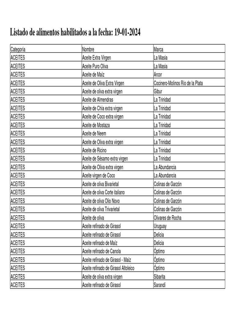Listado de alimentos habilitados a la fecha: 19-01-2024