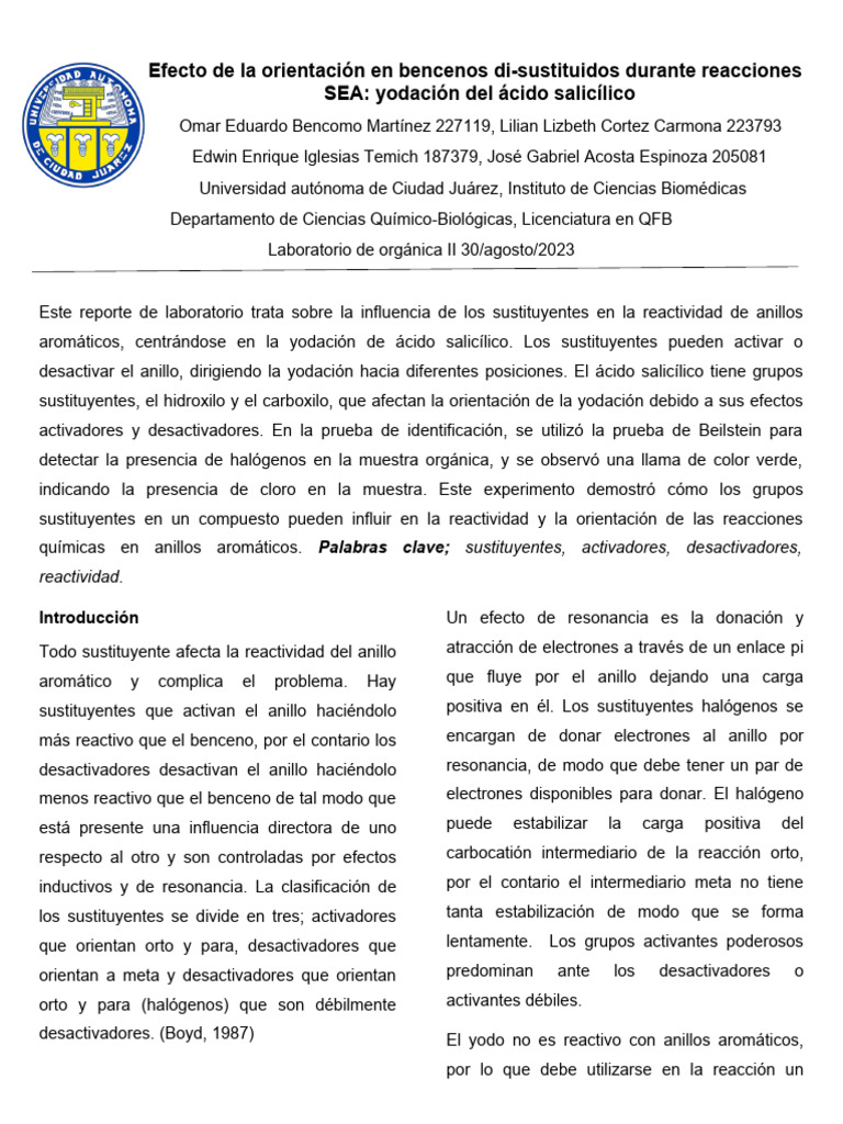 Este reporte de laboratorio trata sobre la influencia de los sustituyentes en la reactividad de anillos