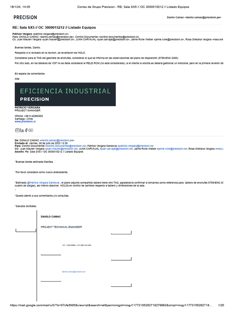 Cc: Danilo Camac <danilo.camac@precision.pe>, Juan Maulen Vergara <juan.maulen@precision.cl>, juan.carvajal@precision.cl <juan.carvajal@precision.cl>, Danitza Valenzuela Co