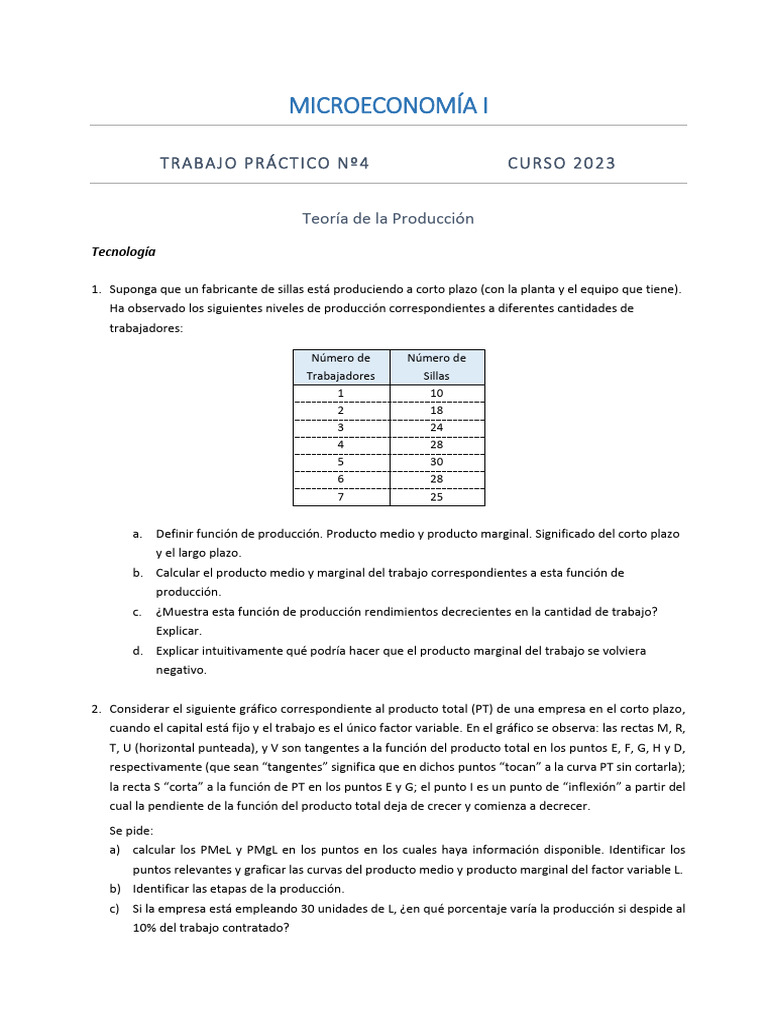 2. Considerar el siguiente gráfico correspondiente al producto total (PT) de una empresa en el corto plazo,