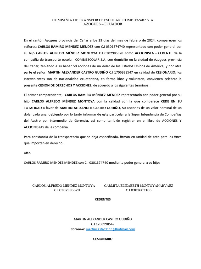 su hijo CARLOS ALFREDO MÉNDEZ MONTOYA C.I 0302985528 como ACCIONISTA - CEDENTE de la