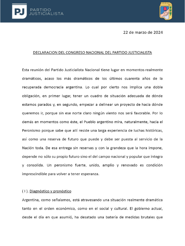 DECLARACION DEL CONGRESO NACIONAL DEL PARTIDO JUSTICIALISTA