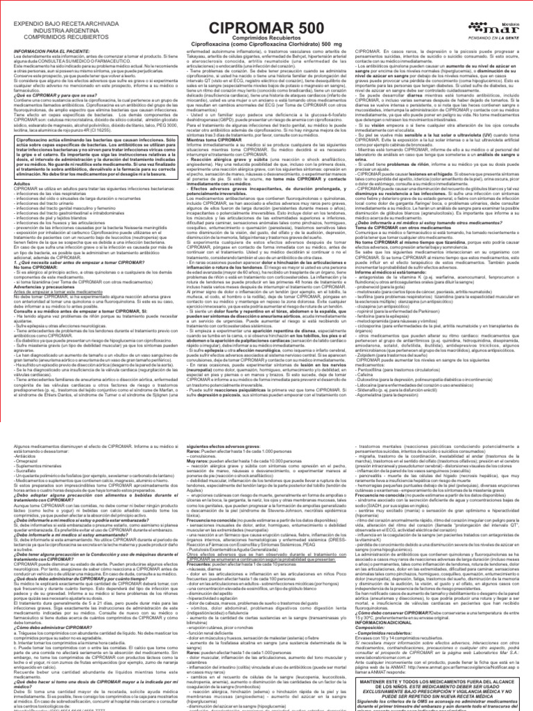 parte de una comida no afectará seriamente en la absorción del medicamento. Sin Raros: pueden afectar hasta 1 de cada 1.000 personas consultar el prospecto de CIPROMAR en la página web Laboratorios Mar S.A.:
