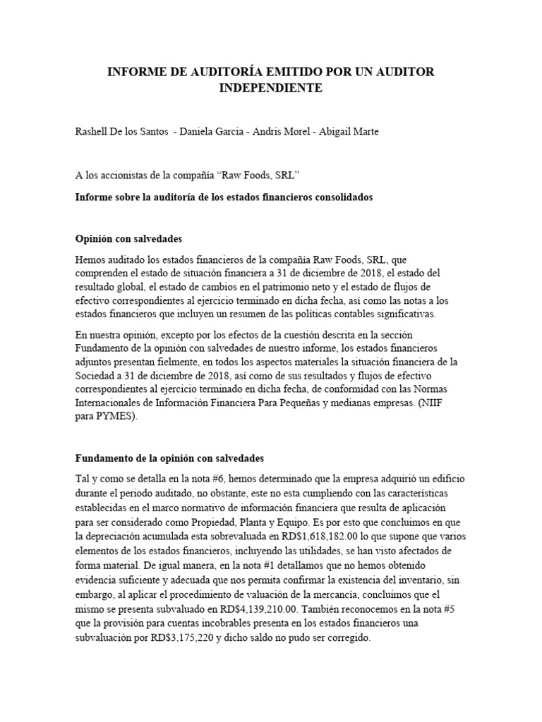 Hemos auditado los estados financieros de la compañía Raw Foods, SRL, que