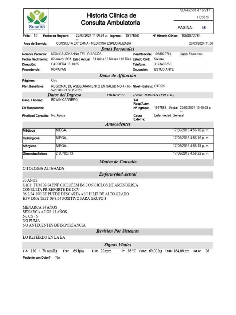 Folio: 12 Fecha de Registro: 20/03/2024 11:06:24 a. Ingreso: 1917658 N° Historia Clinica: 1058972764