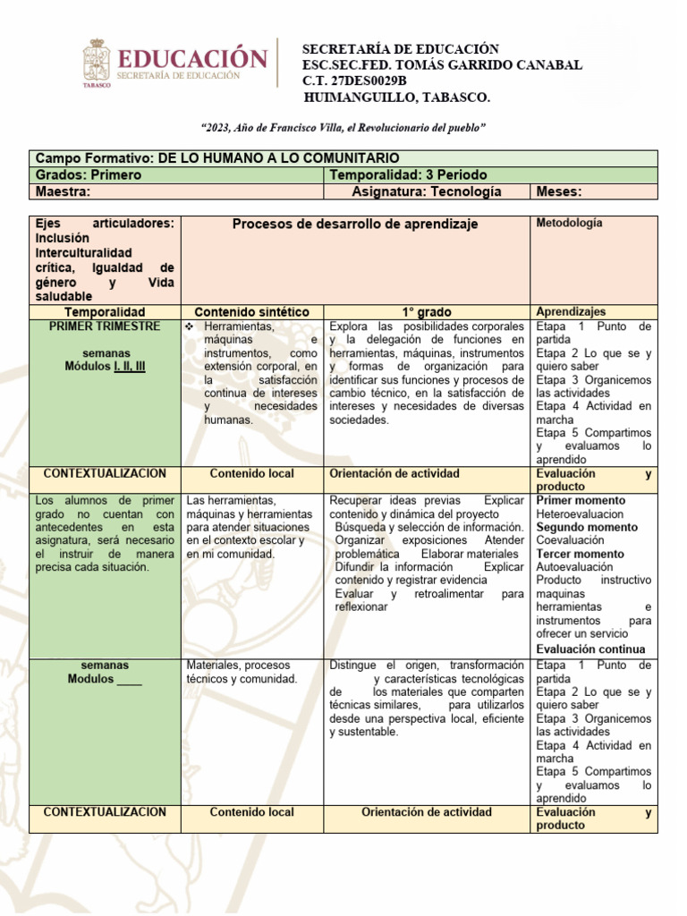 Contenidos primer grado: técnicos, tecnología y evaluación.