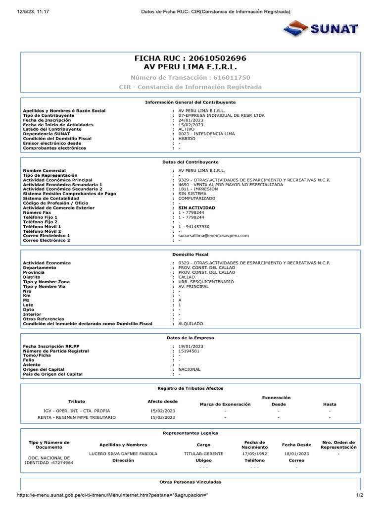 Apellidos y Nombres ó Razón Social : AV PERU LIMA E.I.R.L.