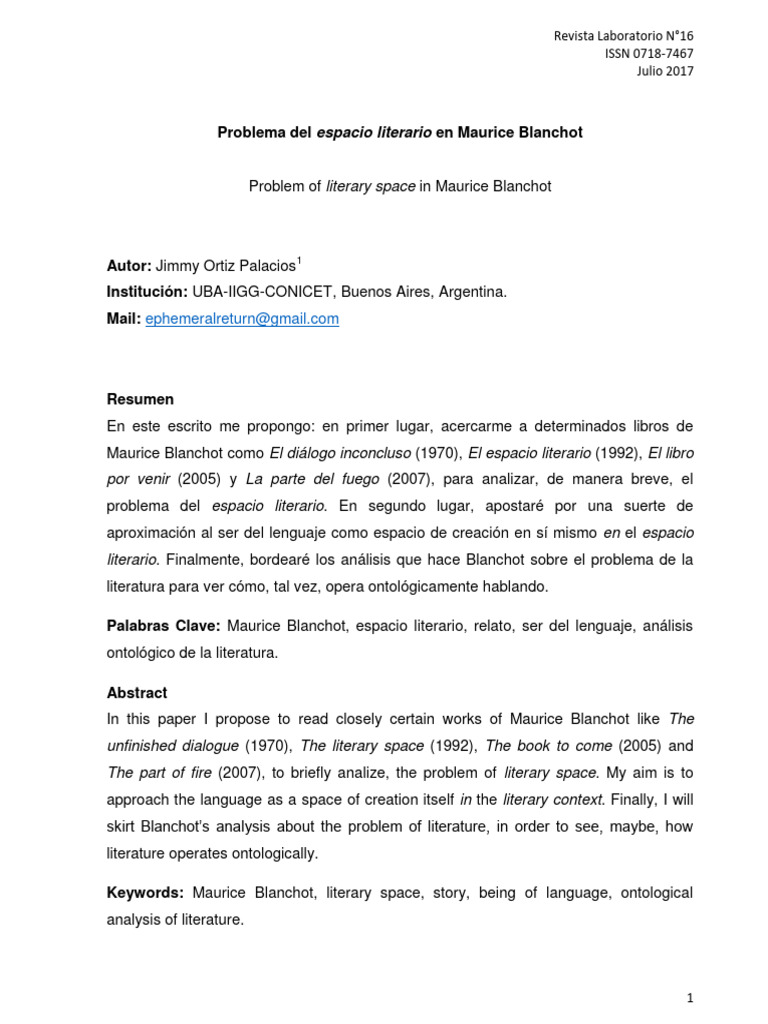 Palabras Clave: Maurice Blanchot, espacio literario, relato, ser del lenguaje, análisis