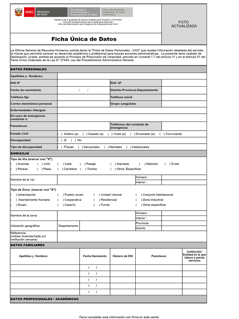 La Oficina General de Recursos Humanos solicita llenar la "Ficha de Datos Personales - CAS" que recaba información detallada del servidor,
