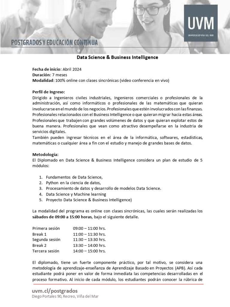 El Diplomado en Data Science & Business Intelligence considera un plan de estudio de 5