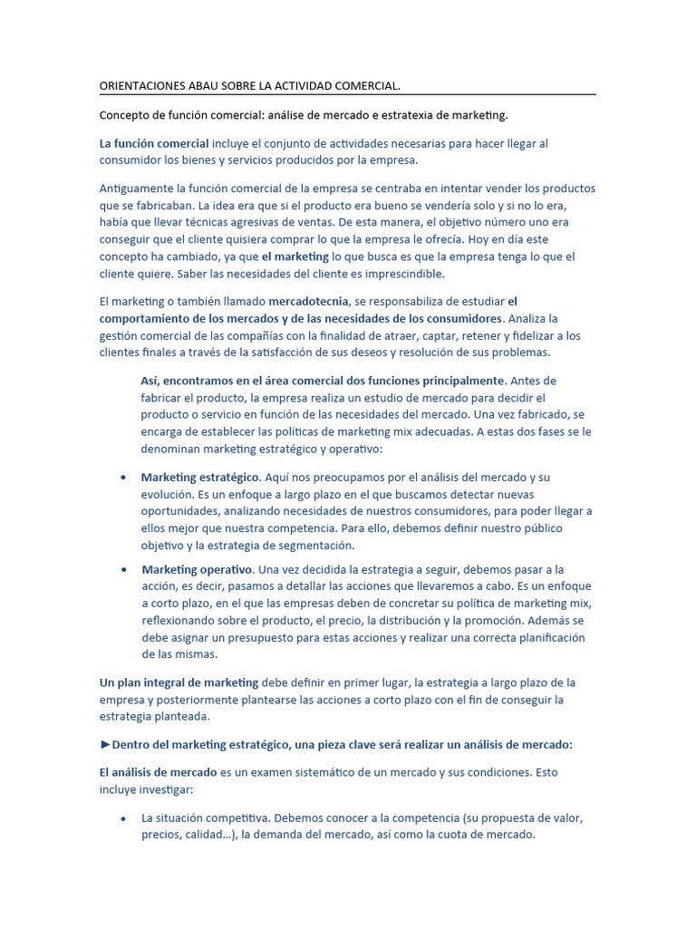 Concepto de función comercial: análise de mercado e estratexia de marketing.
