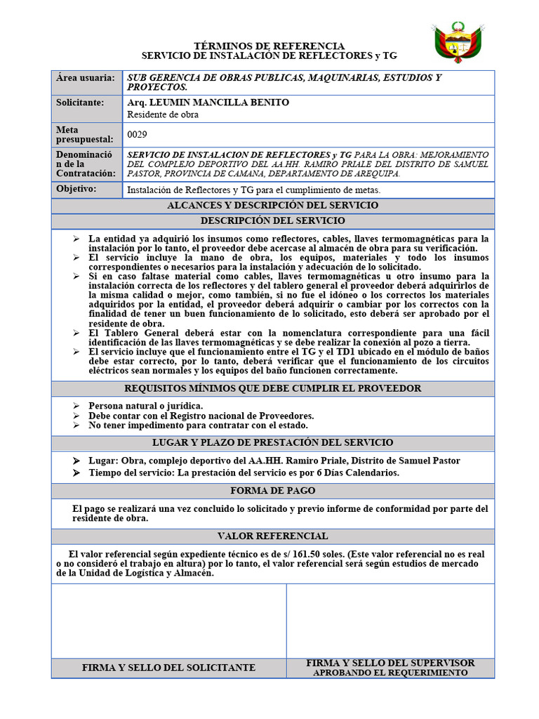 Denominació SERVICIO DE INSTALACION DE REFLECTORES y TG PARA LA OBRA: MEJORAMIENTO