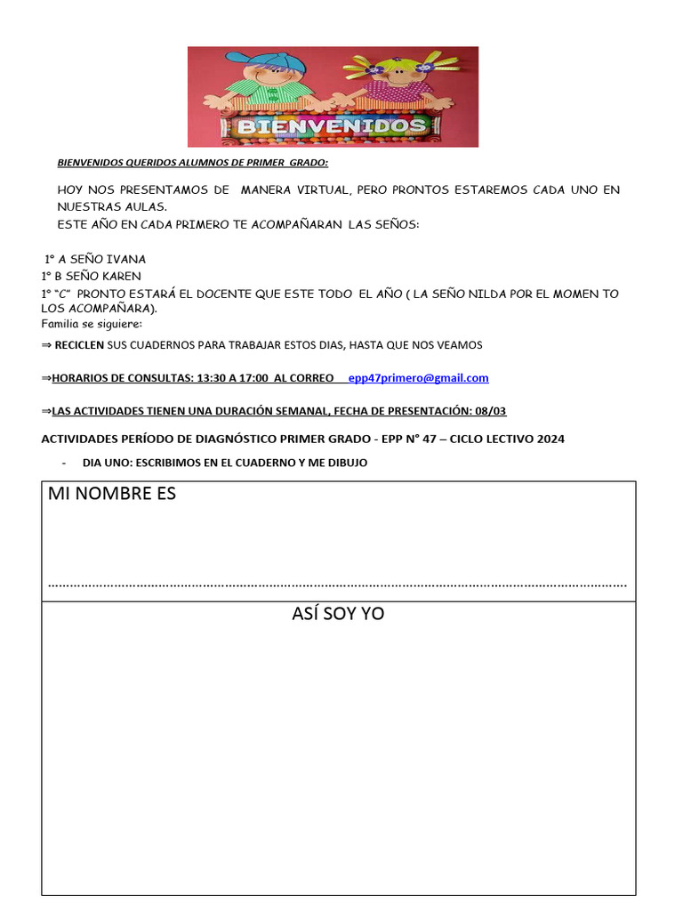 ACTIVIDADES PERÍODO DE DIAGNÓSTICO PRIMER GRADO - EPP N° 47 – CICLO LECTIVO 2024