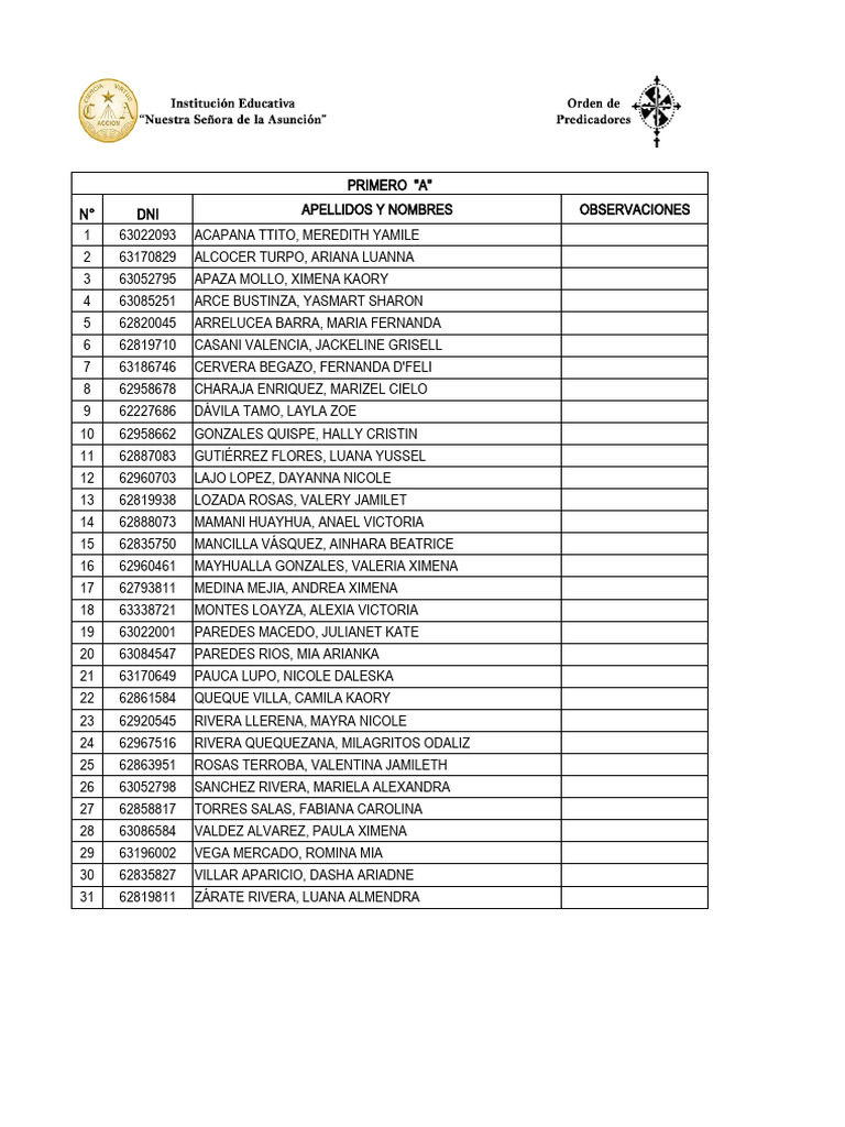 N° DNI APELLIDOS Y NOMBRES OBSERVACIONES