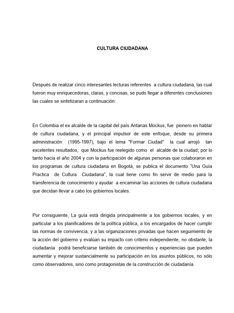 Después de realizar cinco interesantes lecturas referentes a cultura ciudadana, las cual