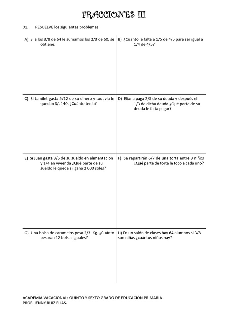 G) Una bolsa de caramelos pesa 2/3 Kg. ¿Cuánto H) En un salón de clases hay 64 alumnos si 3/8