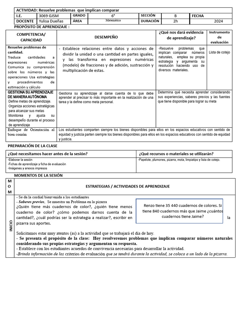 - Se presenta el propósito de la clase: Hoy resolveremos problemas que implican comparar números naturales