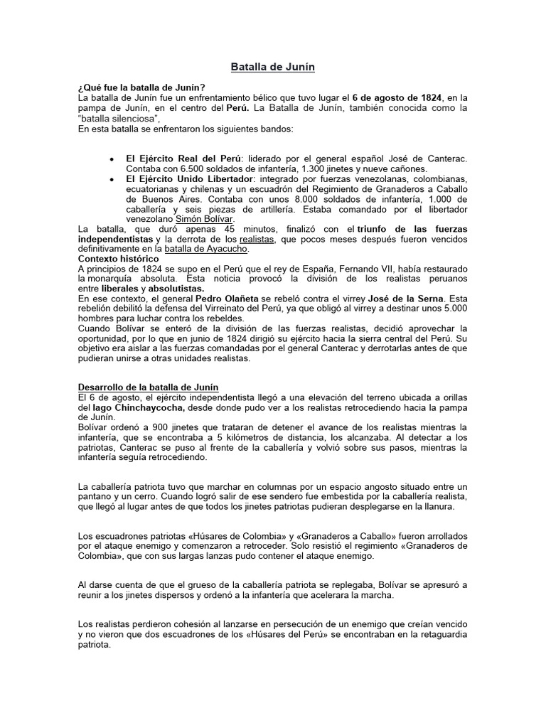La batalla de Junín fue un enfrentamiento bélico que tuvo lugar el 6 de agosto de 1824, en la