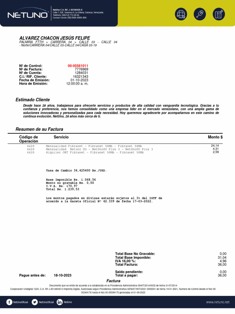6420 Mensualidad Fibranet - Fibranet 50Mb - Fibranet 50Mb 24,14