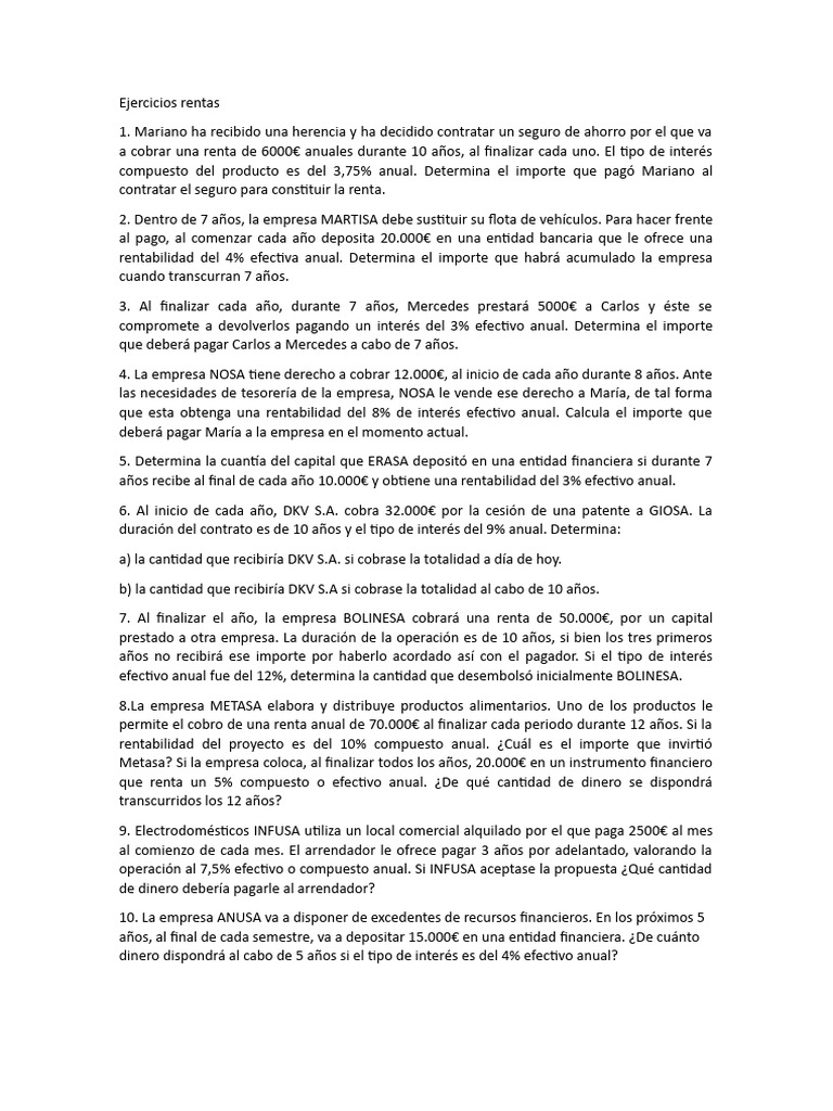 a cobrar una renta de 6000€ anuales durante 10 años, al finalizar cada uno. El tipo de interés