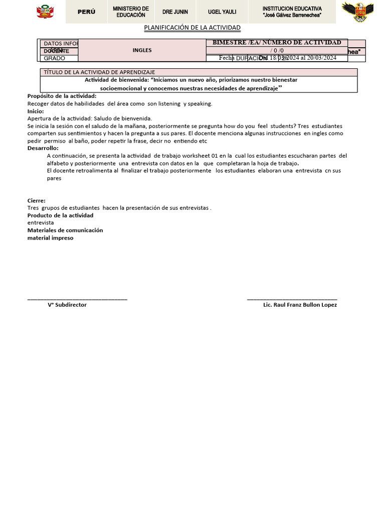 comparten sus sentimientos y hacen la pregunta a sus pares. El docente menciona algunas instrucciones en ingles como