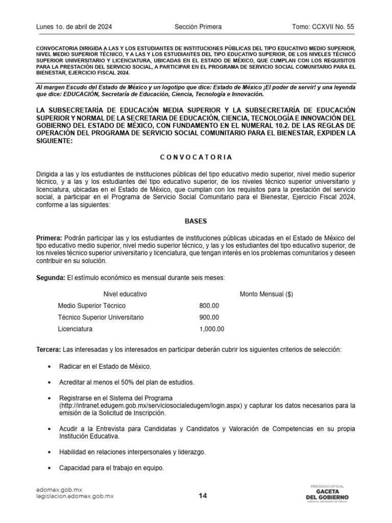 social, a participar en el Programa de Servicio Social Comunitario para el Bienestar, Ejercicio Fiscal 2024,