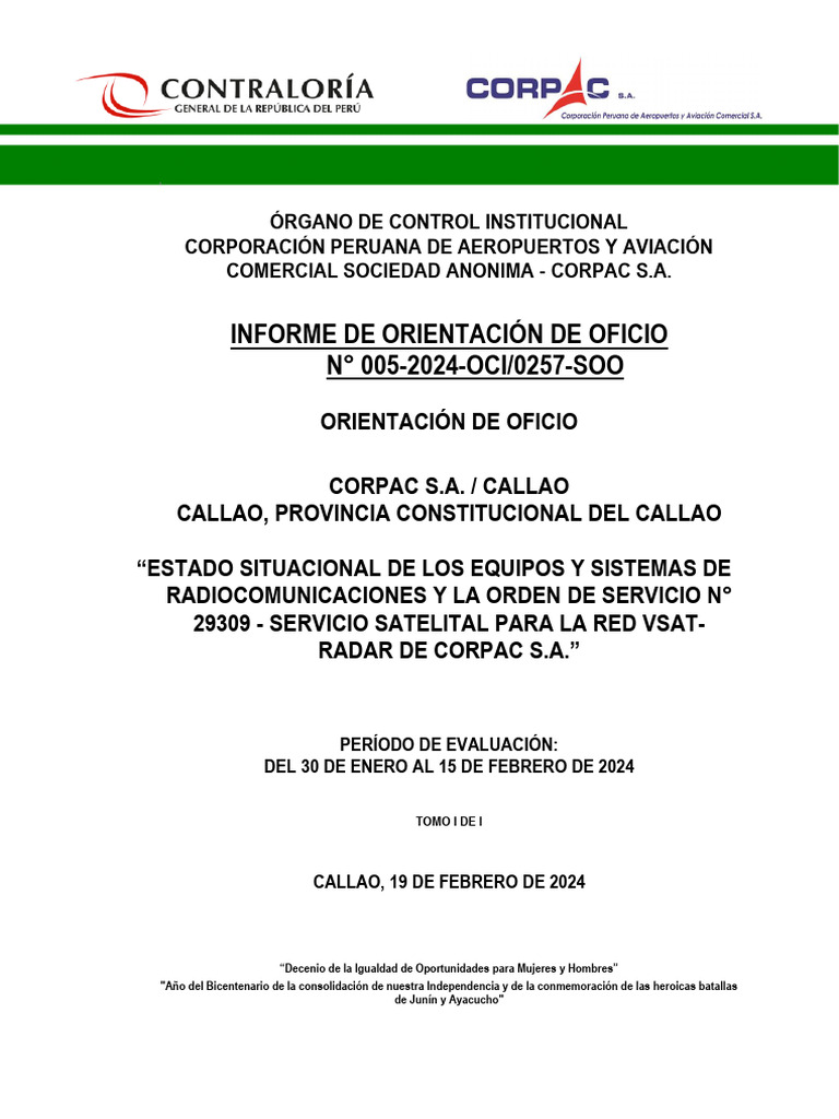 la red VSAT-RADAR de CORPAC S.A.", comunicamos el informe de Orientación de Oficio n.° 005-