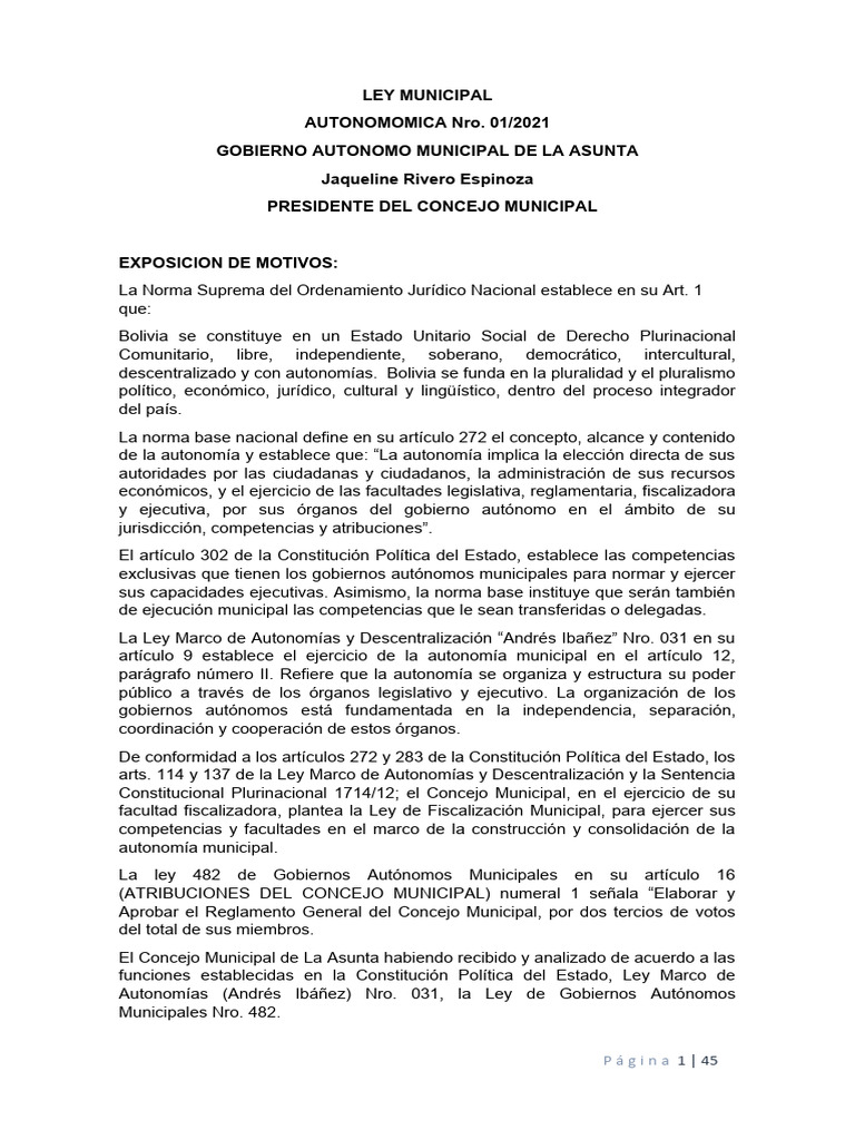 El Concejo Municipal de La Asunta habiendo recibido y analizado de acuerdo a las