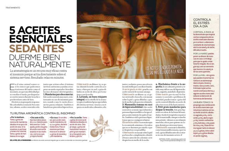 se con frecuencia durante la noche o Este aceite esencial, muy suave, es in- 2. Lavanda, un buen relajante tas) en la tarde o la noche, o en masaje somnio va asociado a problemas de