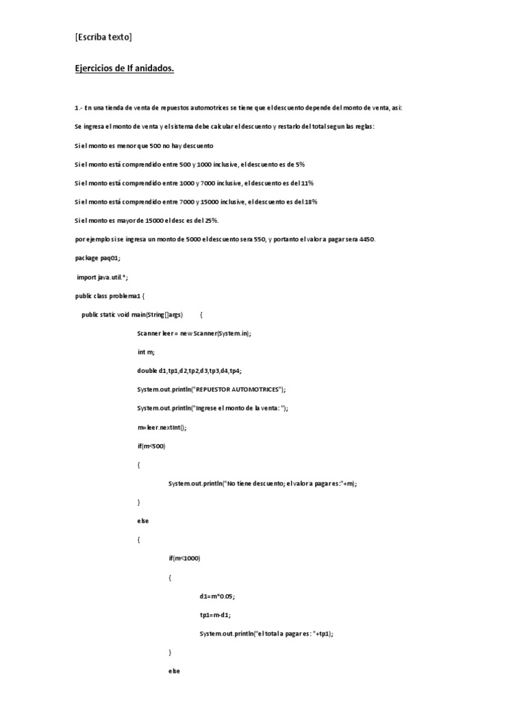Scanner leer = new Scanner(System.in); int m; double d1,tp1,d2,tp2,d3,tp3,d4,tp4; System.out.println("REPUESTOR AUTOMOTRICES"); System.out.println("Ingrese el monto de la venta: "); m=leer.nextInt(); if(m<500) { System.out.println("No tiene descuento; el valor a pagar es:"+m); } else { if(m<1000) { d1=m*0.05; tp1=m-d1; System.out.println("el total a pagar es: "+tp1); } else