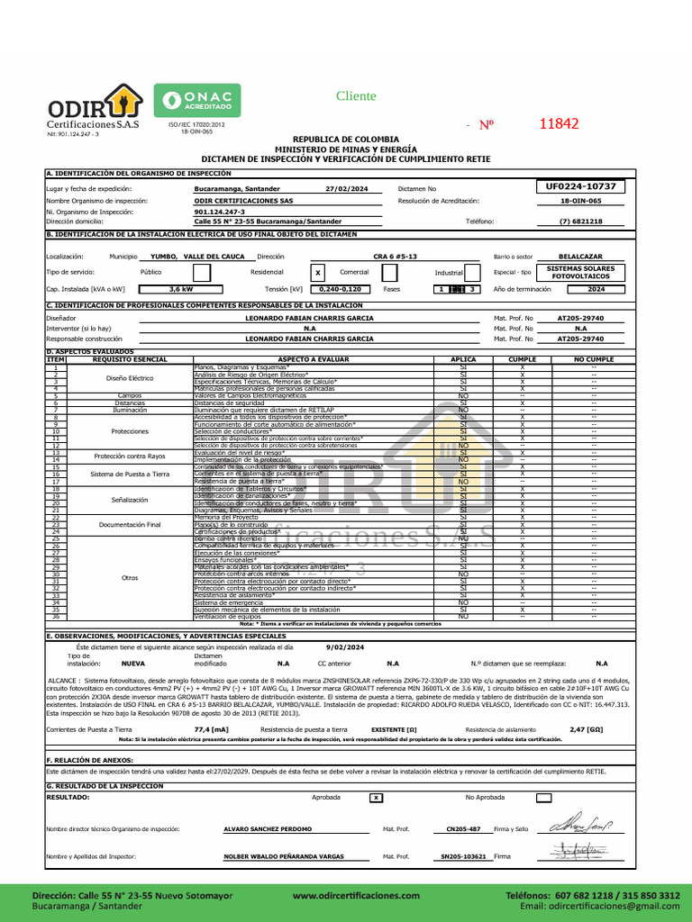 Este dictámen de inspección tendrá una validez hasta el:27/02/2029. Después de ésta fecha se debe volver a revisar la instalación eléctrica y renovar la certificación del cumplimiento RETIE.