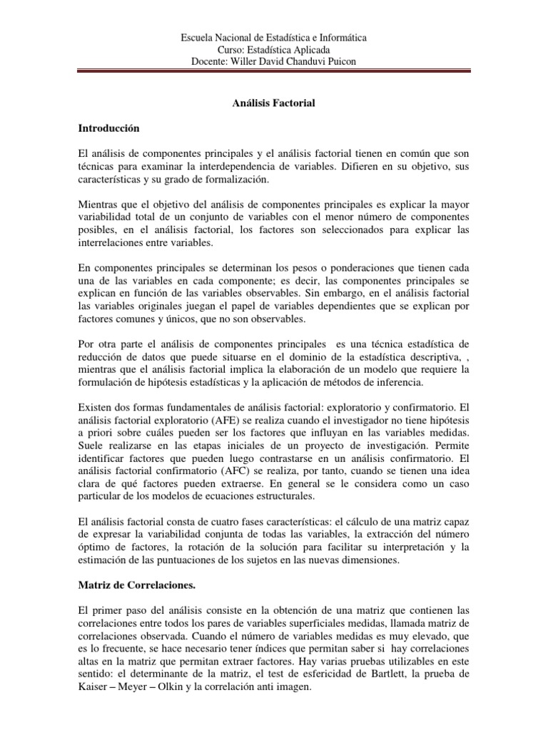 Anlisis Factorial Introduccin El anlisis de componentes principales y el anlisis factorial tienen en comn que son tcnicas para examinar la interdependencia de variables. Difieren en su objetivo, sus caractersticas y su grado de formalizacin. Mientras que el objetivo del anlisis de componentes principales es explicar la mayor variabilidad total de un conjunto de variables con el menor nmero de componentes posibles, en el anlisis factorial, los factores son seleccionados para explicar las interrelaciones entre variables. En componentes principales se determinan los pesos o ponderaciones que tienen cada una de las variables en cada componente; es decir, las componentes principales se explican en funcin de las variables observables. Sin embargo, en el anlisis factorial las variables originales juegan el papel de variables dependientes que se explican por factores comunes y nicos, que no son observables. Por otra parte el anlisis de componentes principales es una tcnica estadstica de reduccin de datos que puede situarse en el dominio de la estadstica descriptiva, , mientras que el anlisis factorial implica la elaboracin de un modelo que requiere la formulacin de hiptesis estadsticas y la aplicacin de mtodos de inferencia. Existen dos formas fundamentales de anlisis factorial: exploratorio y confirmatorio. El anlisis factorial exploratorio (AFE) se realiza cuando el investigador no tiene hiptesis a priori sobre cules pueden ser los factores que influyan en las variables medidas. Suele realizarse en las etapas iniciales de un proyecto de investigacin. Permite identificar factores que pueden luego contrastarse en un anlisis confirmatorio. El anlisis factorial confirmatorio (AFC) se realiza, por tanto, cuando se tienen una idea clara de qu factores pueden extraerse. En general se le considera como un caso particular de los modelos de ecuaciones estructurales. El anlisis factorial consta de cuatro fases caractersticas: el clculo de una matriz capaz de expresar la variabilidad conjunta de todas las variables, la extraccin del nmero ptimo de factores, la rotacin de la solucin para facilitar su interpretacin y la estimacin de las puntuaciones de los sujetos en las nuevas dimensiones. Matriz de Correlaciones. El primer paso del anlisis consiste en la obtencin de una matriz que contienen las correlaciones entre todos los pares de variables superficiales medidas, llamada matriz de correlaciones observada. Cuando el nmero de variables medidas es muy elevado, que es lo frecuente, se hace necesario tener ndices que permitan saber si hay correlaciones altas en la matriz que permitan extraer factores. Hay varias pruebas utilizables en este sentido: el determinante de la matriz, el test de esfericidad de Bartlett, la prueba de Kaiser Meyer Olkin y la correlacin anti imagen.