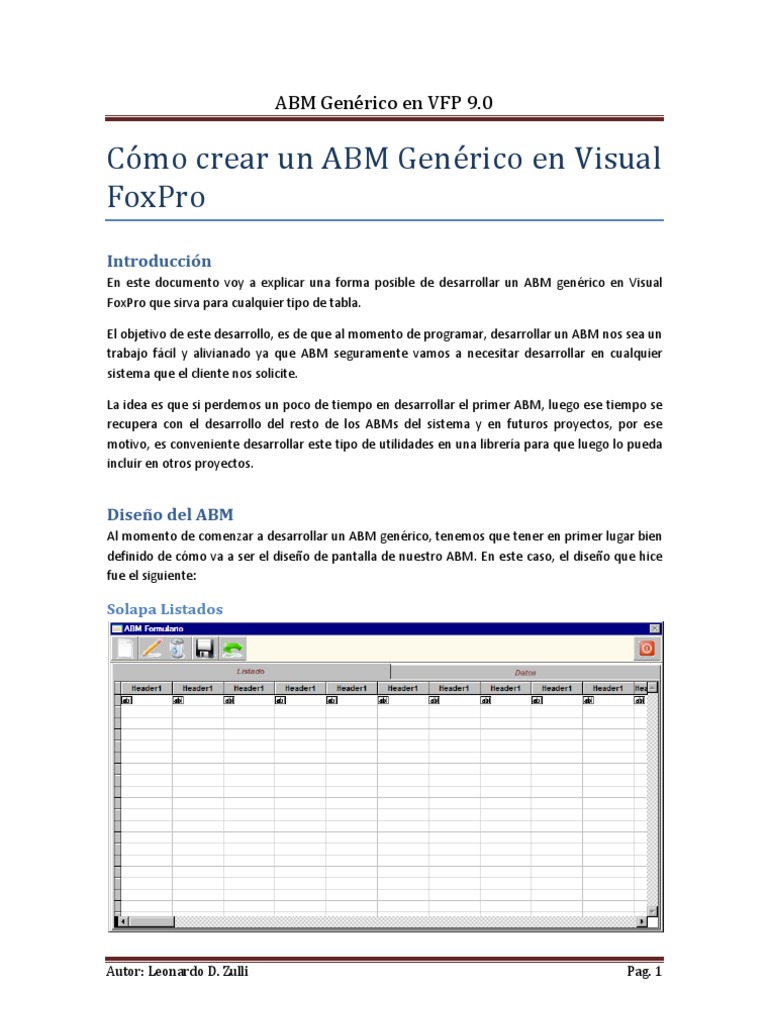 En este documento voy a explicar una forma posible de desarrollar un ABM genrico en Visual FoxPro que sirva para cualquier tipo de tabla. El objetivo de este desarrollo, es de que al momento de programar, desarrollar un ABM nos sea un trabajo fcil y alivianado ya que ABM seguramente vamos a necesitar desarrollar en cualquier sistema que el cliente nos solicite. La idea es que si perdemos un poco de tiempo en desarrollar el primer ABM, luego ese tiempo se recupera con el desarrollo del resto de los ABMs del sistema y en futuros proyectos, por ese motivo, es conveniente desarrollar este tipo de utilidades en una librera para que luego lo pueda incluir en otros proyectos.